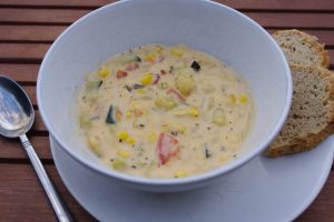 Check out this delicious soup we love to eat in the summer when tomatoes, corn and zucchini are ripe! Zucchini Garden Chowder 2 tablespoons butter Melt in soup pot …